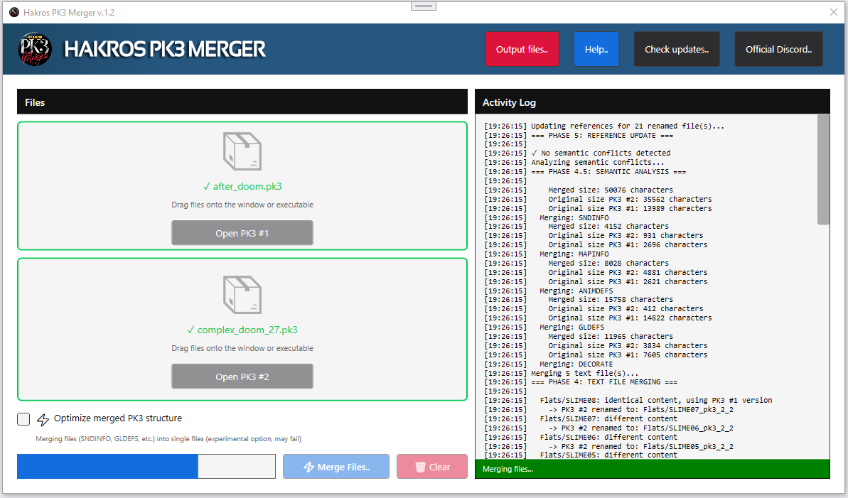 When merging files with duplicate entries (like conflicting textures or DECORATE definitions), the tool provides intelligent options to handle conflicts, allowing users to choose which version of a file to keep or how to prioritize them.